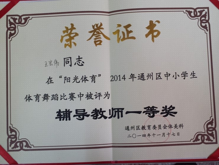 1.体育舞蹈队荣获2014年通州区中学生体育舞蹈比赛中学组团体总分第五名,王宏伟老师被评为辅导教师一等奖。