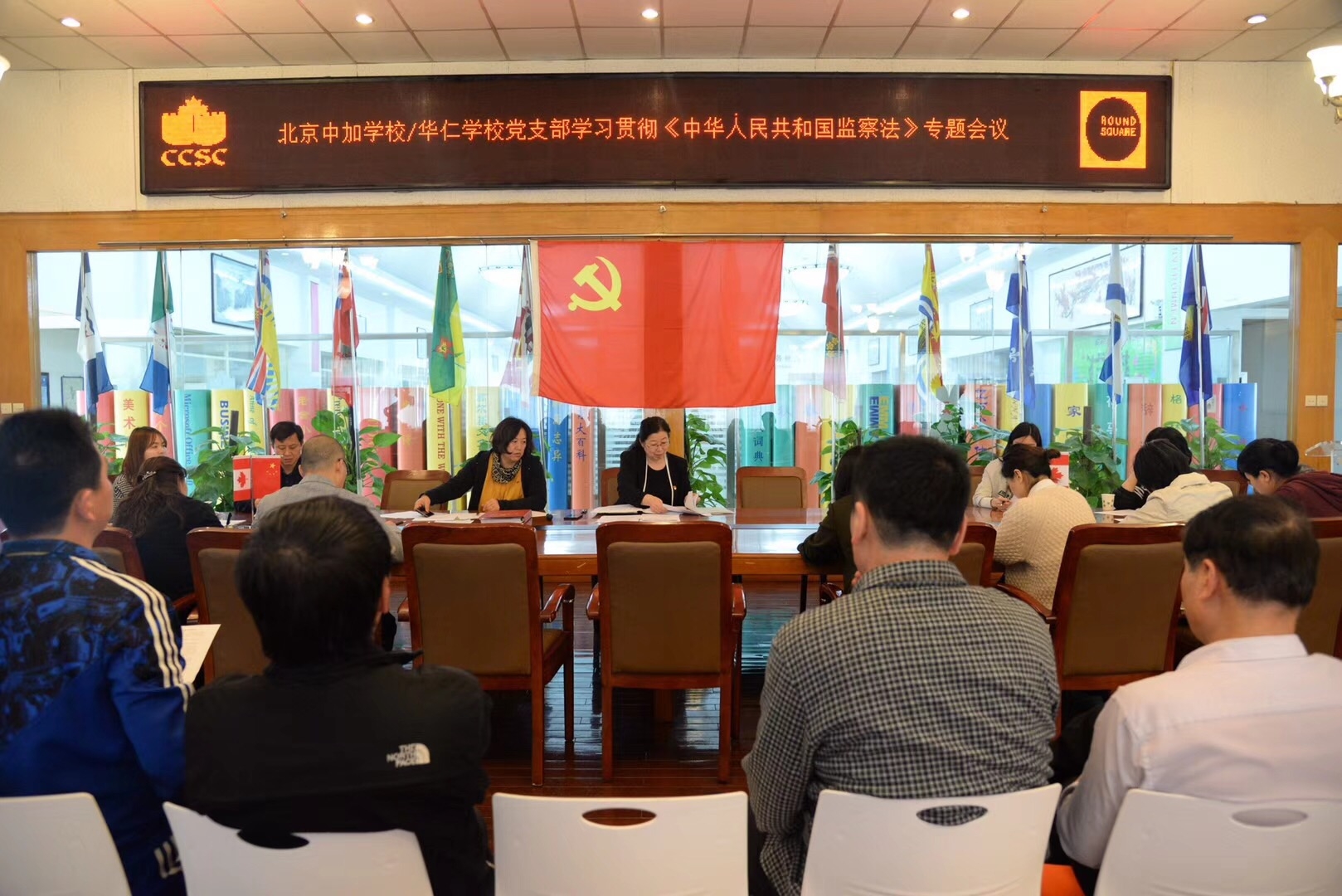 北京中加学校/华仁学校党支部按照通州区委教工委“关于在两学一做学习教育中深入学习贯彻《中华人民共和国监察法》的通知”精神,组织党员学习宣传贯彻《中华人民共和国监察法》,落实“两学一做”学习教育常态化制度化,进一步加强党员教育管理,引导党员对照合格党员要求,不断提升规矩意识和纪律意识,增强法治观念,时刻心存戒尺,自觉接受监督,严格依法用权。营造全校党员干部学法、知法、尊法、守法氛围。