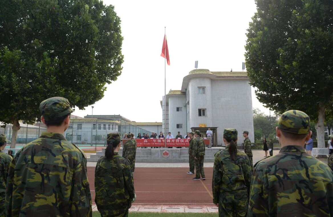 2018年8月27日上午8:00—8:40,"2018级新生军训开营式"在我校操场隆重举行。仪式由学部主任曹晓鹏先生主持,我校执行校长田振周先生,加方副校长Thom Sunega先生,党支部书记、副校长荆枝女士,副校长马小葵女士、张卫红女士、马戈先生,武警总队军训教官,全体外籍教师与高一新生共同参加。