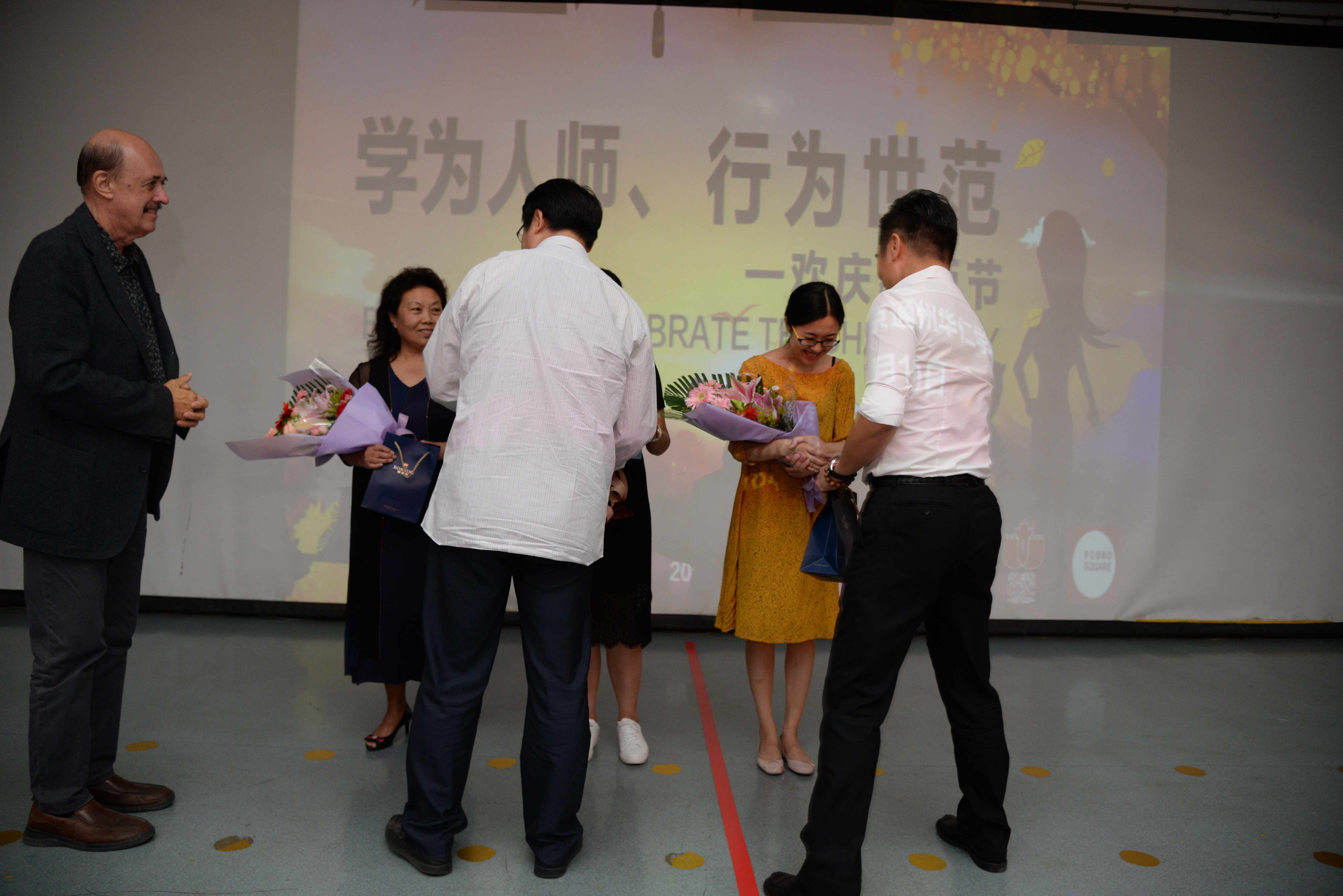 首先,北京中加学校执行董事Andy Truong先生代表董事会,在大会上向全体教师送上了温馨的节日祝福,感谢教职工们为学校的发展壮大做出了卓越贡献。随后,执行校长田振周先生宣布仲兆芳老师获得北京市师德先锋荣誉称号及2017-2018学年度第二学期获得先进的优秀教职工名单。Andy Truong先生为优秀教职工代表仲兆芳老师颁发奖状,鼓励教师们热爱教育事业,积极进取,开拓创新,并宣读在北京中加学校工作满五周年的教职工名单,学校领导为他们颁发在校五周年纪念品,学生代表向他们敬献鲜花。此次教师节活动主题“学为人师,行为世范”是全体教职工的共同追求和神圣职责。