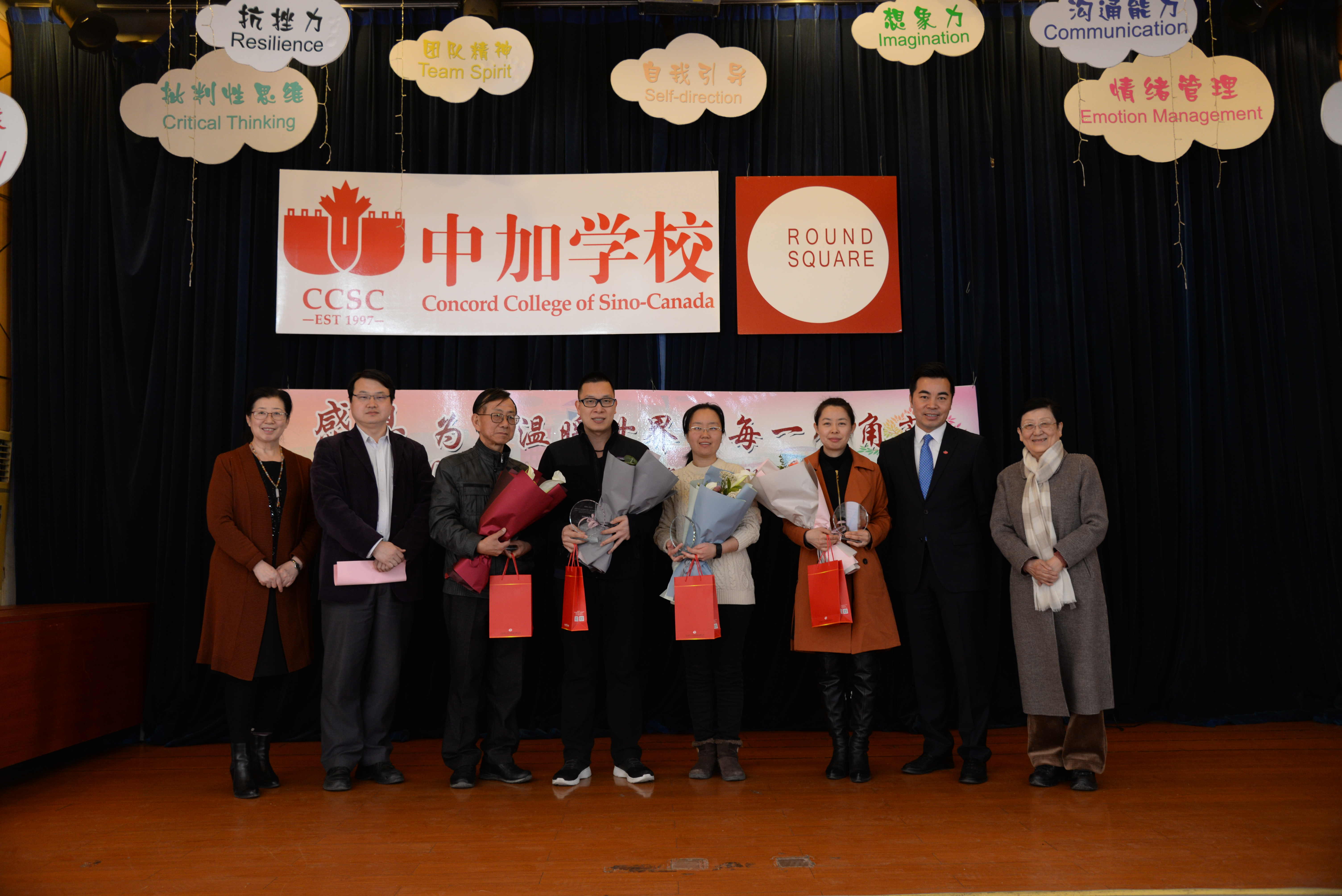 中午12:00,全校中外教职工在学校餐厅举行了北京中加学校建校二十二周年教职工庆祝活动,执行董事Andy Truong先生致辞,代表董事会向全校教职工表示亲切的问候,感谢教职工们为学校二十二年的发展付出的心血和汗水。薛梅校长宣读今年在校工作满十周年、十五周年的教职员工名单,董事会领导和校领导为他们颁发纪念品、纪念牌,学生代表为他们献上鲜花;田振周执行校长宣读2018-2019学年度第一学期获得优秀奖项的教职工名单,荆枝书记宣读在通州区教育系统开展的师德评选活动及才艺比赛中获奖的教师名单,并为他们颁发奖状和纪念品。食堂为教职工们准备了丰盛的午餐和美味的蛋糕,庆祝北京中加学校22周年生日。校办何淼滔老师和小学部周楠老师担任了此次庆祝活动的中英文主持。