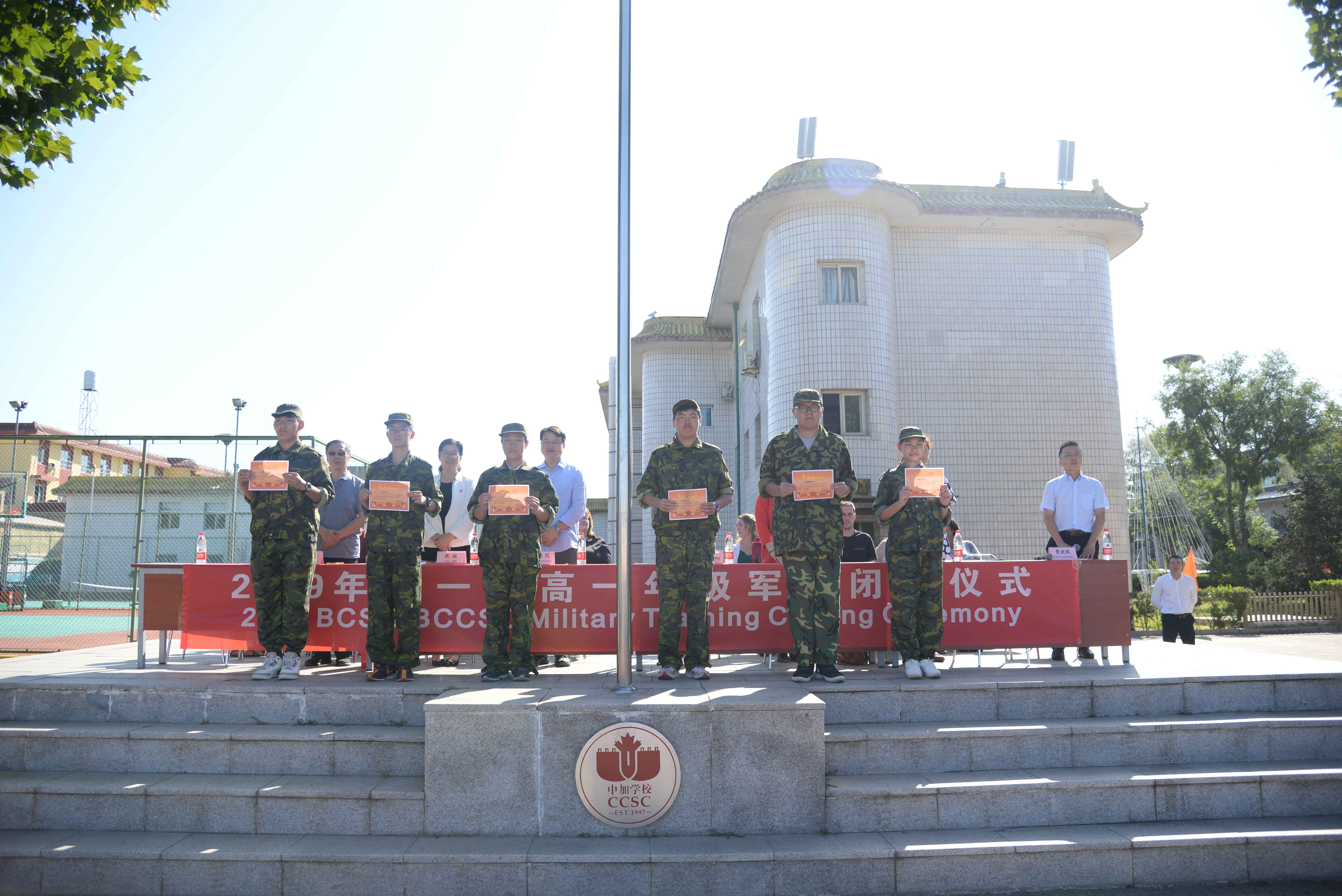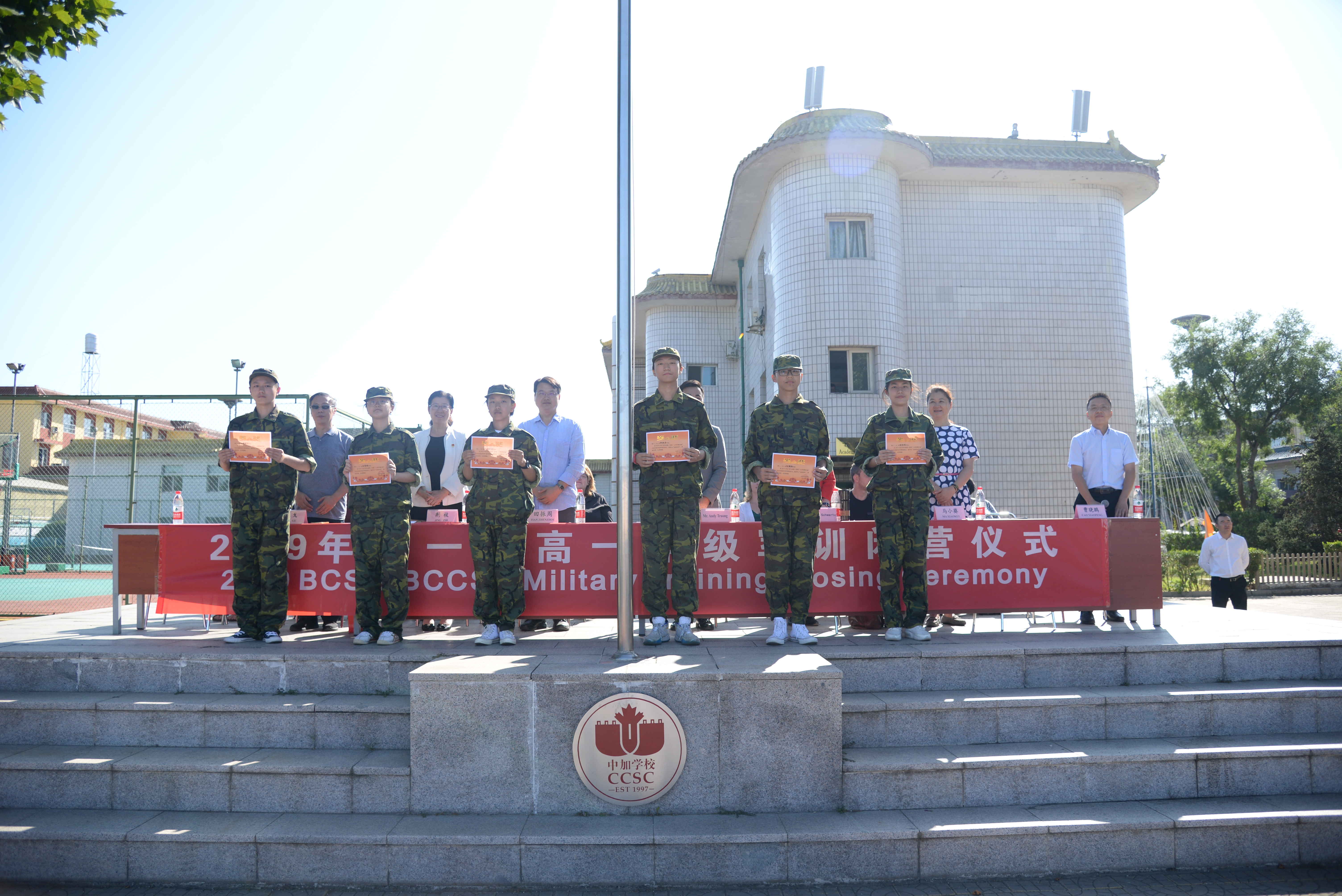 军歌嘹亮,迷彩飞扬。8月30日上午,我校2019级新生军训圆满闭营,为期五天的军训正式结束。执行董事Mr.Andy Truong,执行校长田振周先生,党支部书记荆枝女士,加方副校长Ms.Laurel Schwartz,副校长马小葵女士,副校长马戈先生以及外籍教师和部分学生家长出席了闭营式,闭营式由学部曹晓鹏主任主持。