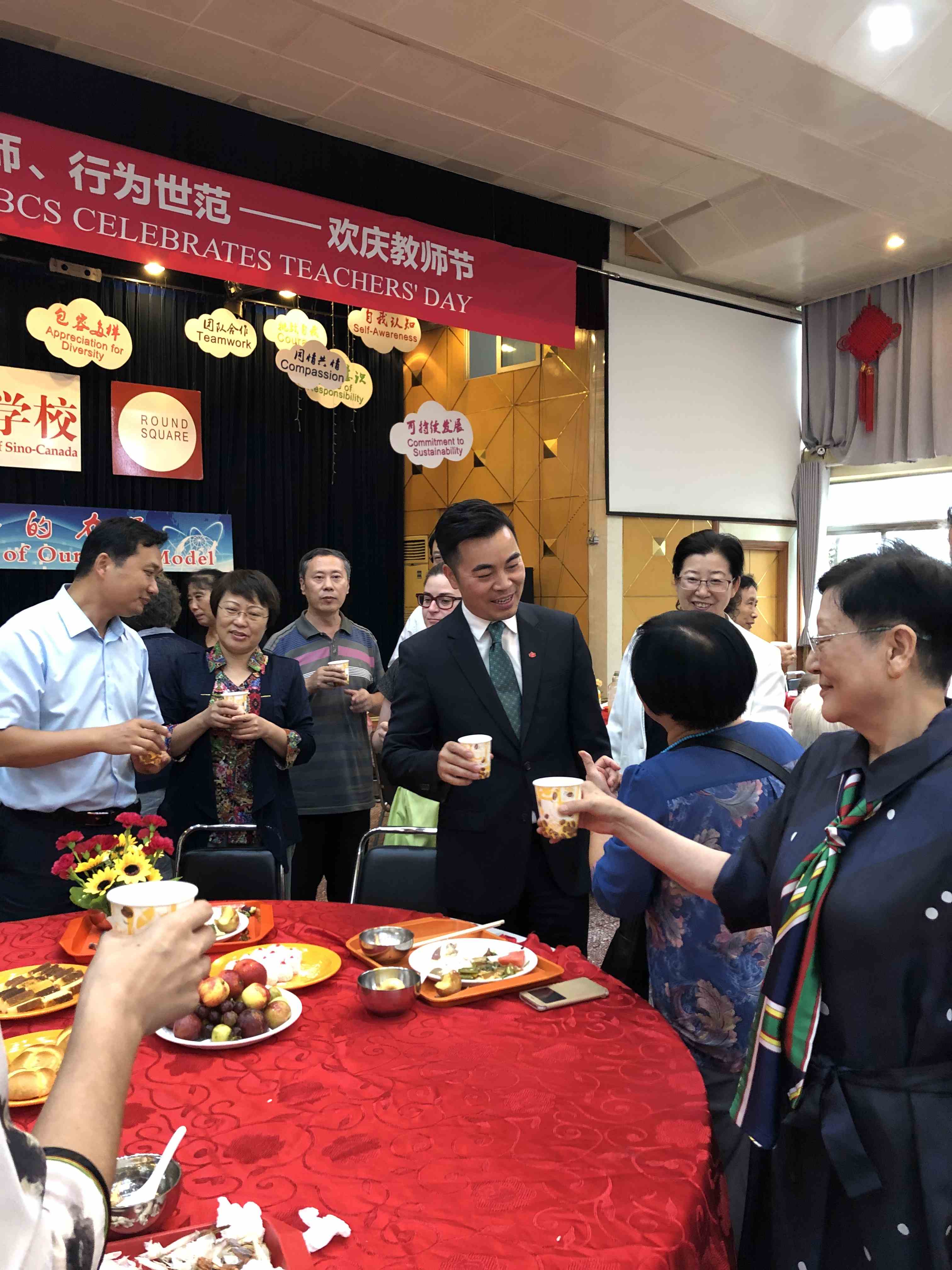中午12点,教师们步入了教工食堂,大家欢聚一堂庆祝教师节活动暨优秀教职工表彰大会。首先,北京中加学校执行董事Andy Truong先生代表董事会,在大会上发表了热情洋溢的讲话,向全校教职工致以诚挚的节日问候。今年是北京中加学校建校23周年,Andy Truong先生衷心感谢教职工们为学校长足发展做出的杰出贡献。薛梅校长宣读在校工作满五周年的教职工名单,学校领导为他们颁发在校五周年纪念品,学生代表向他们敬献鲜花。随后,执行校长田振周先生宣读了2018-2019学年第二学期获得优秀奖项的教职工名单。食堂的工作人员更是为全体教职员工精心制作了丰盛美味的自助午餐、时令海鲜、精致可口的糕点蛋糕,整个庆祝活动在全体教职员工的欢声笑语中落下帷幕。