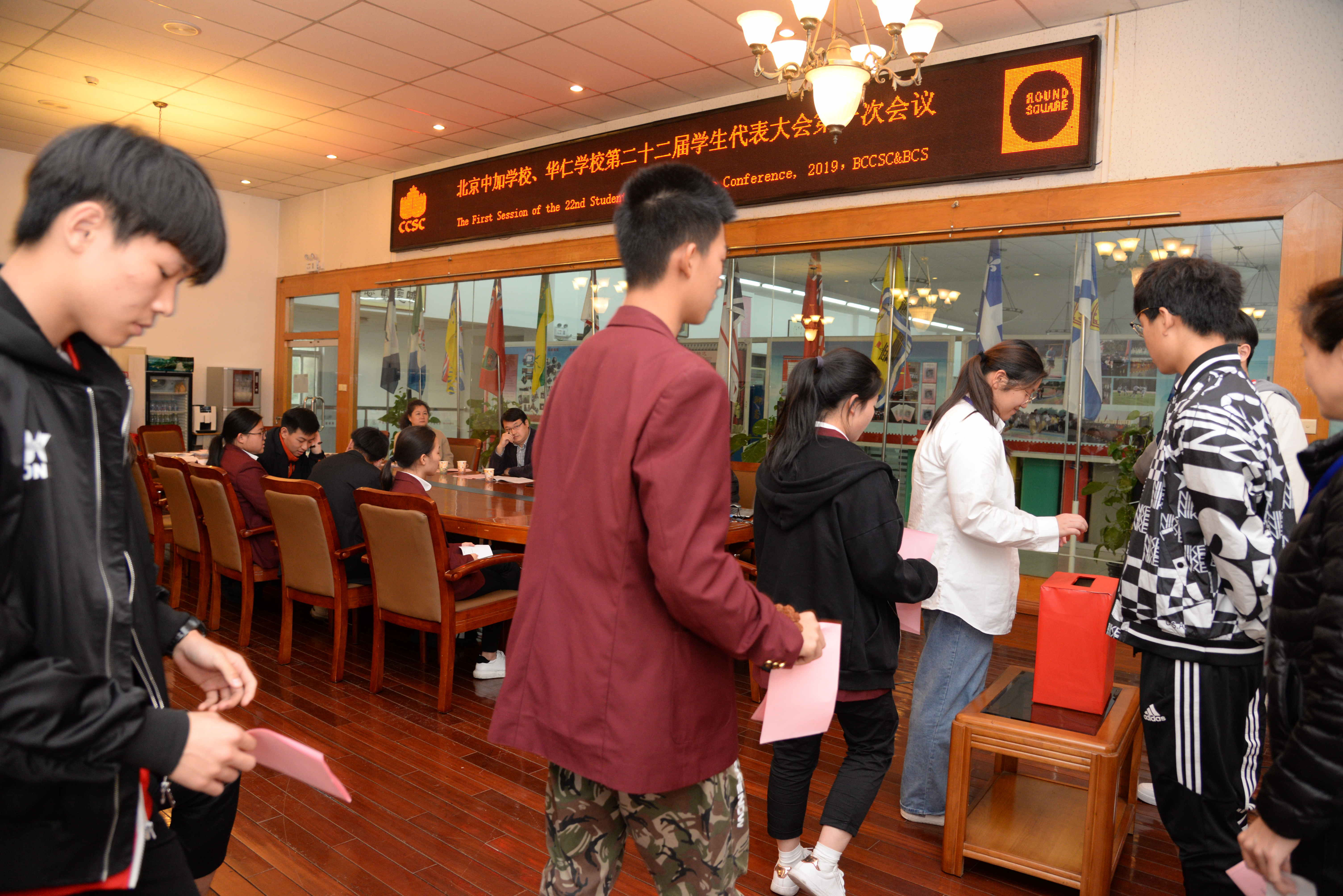 2019年10月24日北京中加学校学生代表大会第一次会议在综合楼会议室顺利召开。执行校长田振周先生、加方副校长Ms.Laurel Schwartz、副校长马小葵女士、学部主任曹晓鹏先生、学生处副主任张刚先生及中学部学生代表35人出席会议。开幕式上,Ms.Laurel Schwartz致辞:希望学代会的代表们能真正服务于同学,协助和促进学校的教育和管理工作,并希望学生干部携手共进、以身作则,充分发挥引领的作用,在学生组织这个平台上绽放自己多彩的青春。