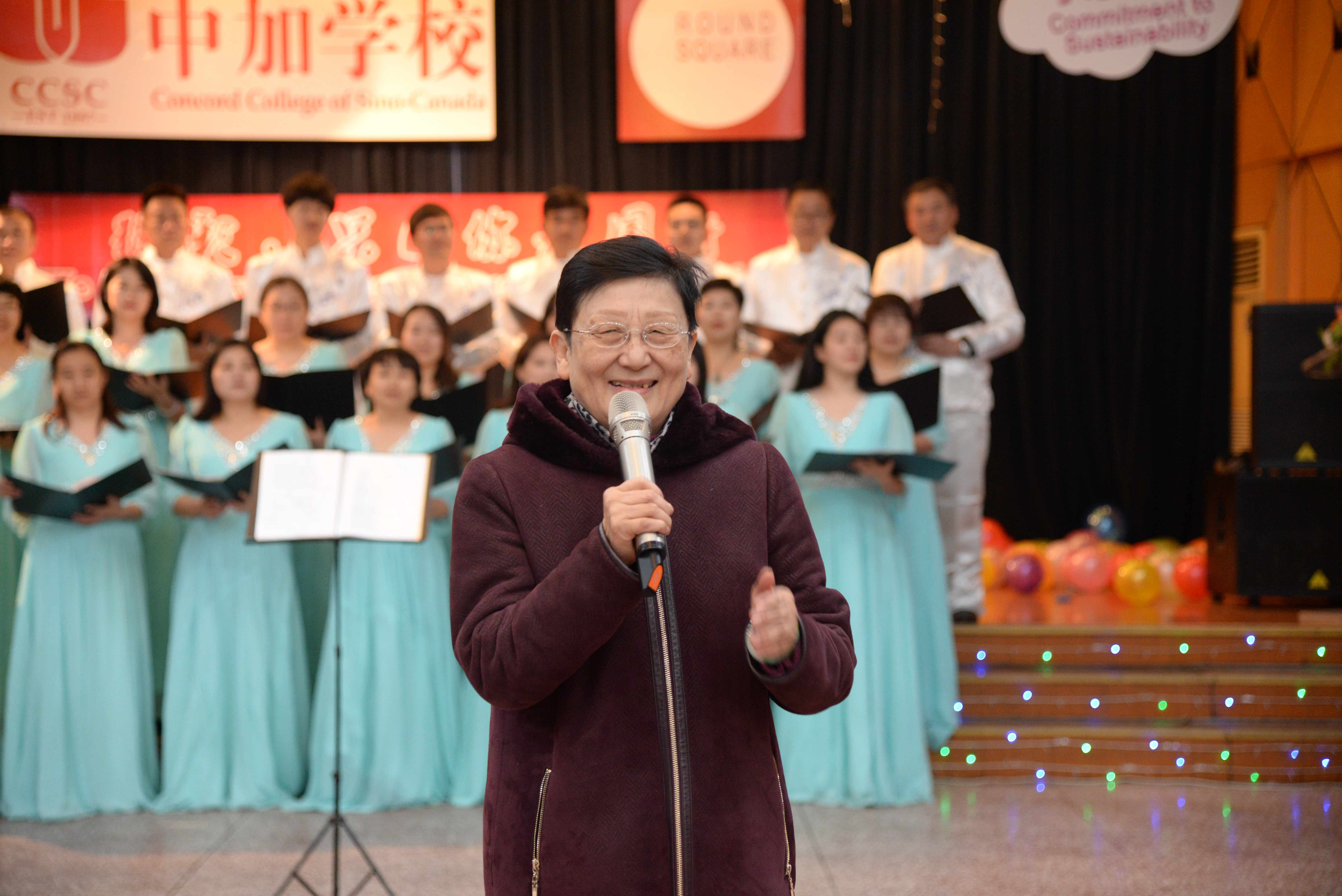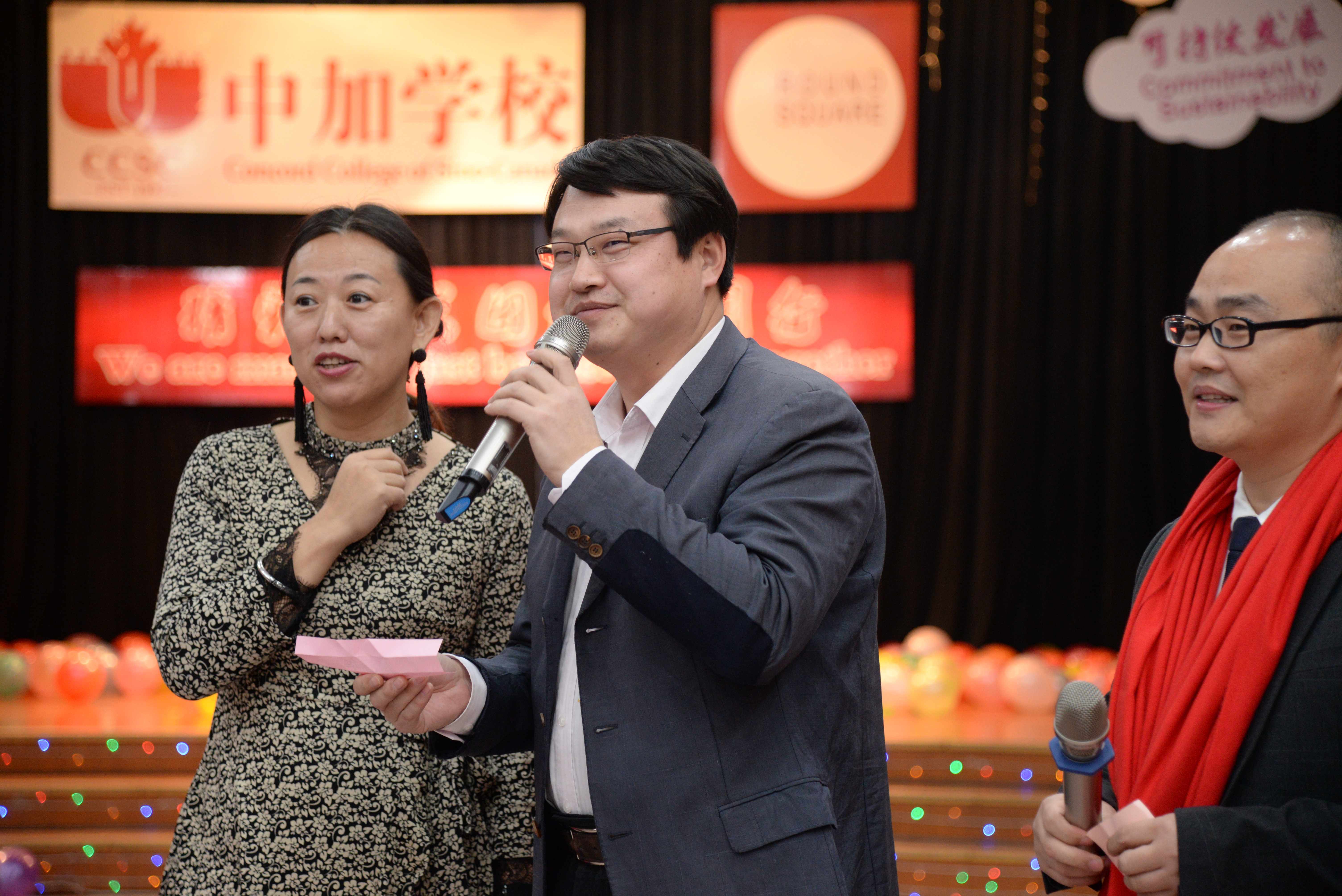2019年12月28日晚,北京中加学校/北京通州华仁学校/北京加中和美物业管理有限公司教职工新年联欢晚会在学校餐厅隆重举行。校长薛梅女士、执行校长田振周先生,书记荆枝女士等校领导与全体教职工一起参加了联欢晚会活动,校长薛梅女士致新年贺 辞。