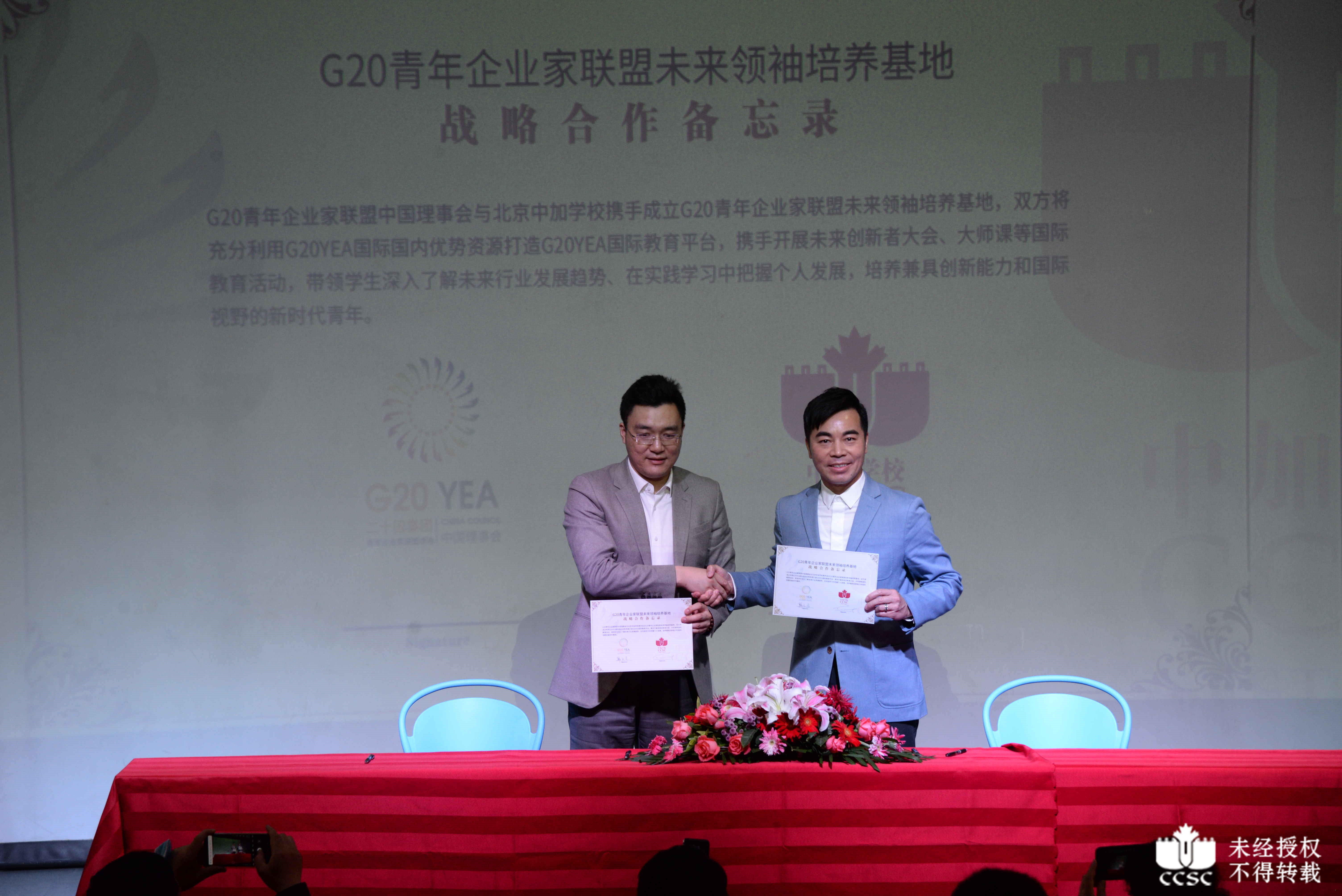5月6日,G20青年企业家联盟(G20 Young Entrepreneurs’ Alliance, G20YEA)未来领袖培养基地签约仪式暨主题交流活动在北京中加学校举行。G20YEA中国理事会理事长韩天启,北京中加学校执行董事Andy Truong,执行校长田振周,党支部书记、副校长荆枝,副校长马小葵等领导嘉宾与高中全体师生、家长代表共同出席了签约仪式。