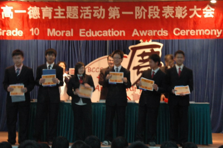 高一年级组本学期第一阶段德育主题活动表彰大会在2008年5月12日晚7:00——7:30在学校风雨球场举行。刘文莲书记、田振周副校长出席大会并为获得表彰的学生颁发奖状和奖品,田校长还发表了讲话,同学们深受鼓舞。