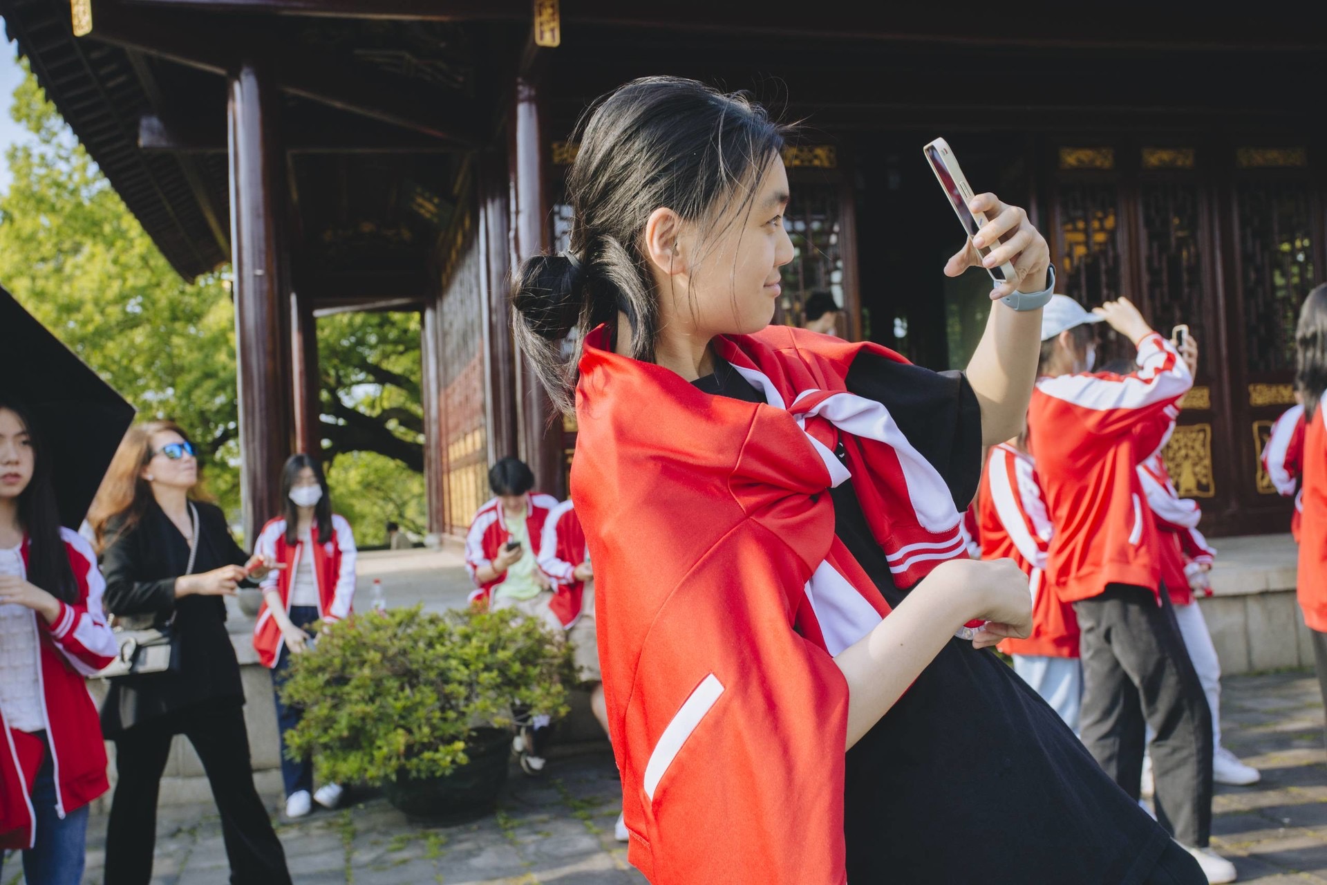 沿着湖边拾级而上,同学们站在“南极潇湘”亭子里,“遥望洞庭山水翠,白银盘里一青螺。”眼前之景恰似一幅山水巨画在大家面前瞬间铺开,令同学们叹为观止。