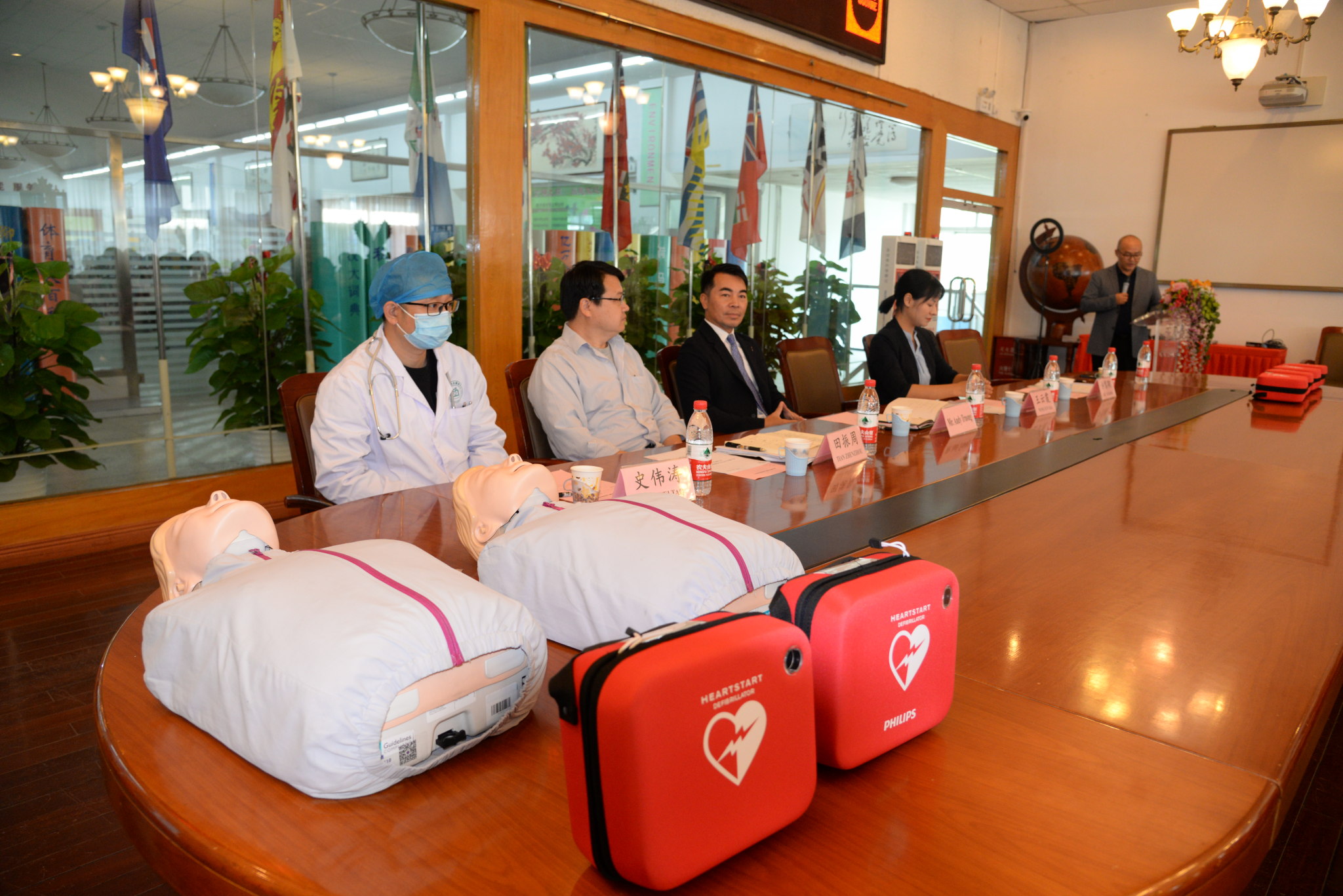 AED捐赠暨心脏急救技能培训仪式在我校综合楼会议室举行。石基会秘书长王云霞女士、我校副董事长Andy Truong先生、执行校长田振周先生、卫生健康副校长史伟涛先生、石基会理事许黎翔先生及教职工、学生代表出席,副校长张刚先生主持了捐赠仪式。