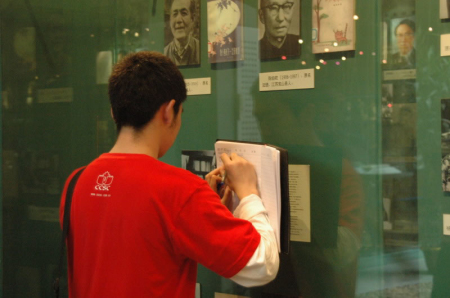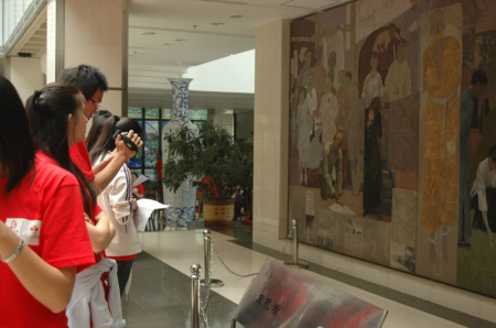 5月16日,在北京现代文学馆内,一个个红色的身影忙碌地穿梭于展馆的每个角落,有的簇拥着认真倾听馆员的解说,有的仔细欣赏馆内的展品,有的精心地和“文学大师们”拍照留念。