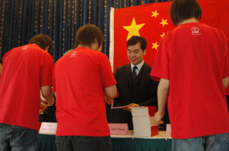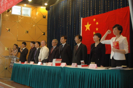 2008年5月15日上午9时30分,北京中加学校2005级学生成人冠礼仪式在教工食堂隆重召开。在主席台就座的的有:学校执行董事AndyTruong先生、执行校长孟学军先生、副校长姜涛先生、加方校长ColinChilds先生、加拿大大法官lampe日t 先生、年级组长马小葵老师和家长代表金骁静女士。