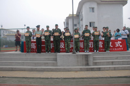 接着,军队首长宣布了军训获奖排、优秀训练标兵和优秀训练学员的名单。每念到一个排的获奖学生他们都高声喊:“到”,并出列站好,跑步上台领奖。到台上后,每一个学生都敬军礼向领导问好,领取了自己在中加的第一份奖状,并且与校领导合影留念。在领奖期间,台上台下掌声不断。