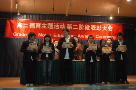 2008年9月8日晚7:00——7:30,高二年级组在学校风雨操场举行上学期德育主题活动表彰大会,获得德育奖的学生以及获得优秀电教员、优秀安全员的学生先后登上主席台,接受领导颁奖。校执行董事AndyChuang先生、执行校长孟学军先生、田振周校长等出席并颁奖,孟校长还发表了热情洋溢的讲话。会议秩序井然,同学深受鼓舞。
