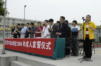2004年5月11日(星期二)上午8点30分,高三年级全体师生在我校操场东侧参加了由“18岁成人宣誓仪式”。本次活动由高三年级组、学生处共同组织,高职教行政主管Andy Troung、孟学军校长、加籍校长Beverly Graves、刘晋校长、夏国桢主任、田振周主任、荆枝主任等中层领导干部均应邀出席了本次活动。学生家长李晓拓先生作为家长代表特约嘉宾也参加了这次活动。